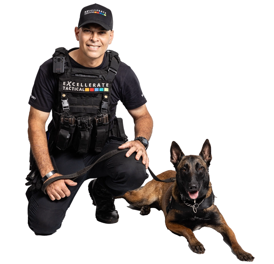 Excellerate K9 Unit features professionally trained Belgian Malinois and German Shepherds, selected for their exceptional intelligence, loyalty, and working drive. Our dogs undergo rigorous training programmes specialising in narcotics detection, tracking, and protection work, maintaining peak performance through continuous development and certification. Each dog is paired with experienced handlers who understand canine behaviour, scent work, and tactical operations. Our training programmes ensure consistent quality and reliability across all K9 services. With strong working bloodlines and specialised training protocols, our dogs demonstrate superior performance in challenging conditions. Regular health monitoring, ongoing training, and handler-dog partnership development guarantee professional service delivery. Our K9 teams represent the pinnacle of detection and protection capabilities, serving clients across South Africa with proven expertise